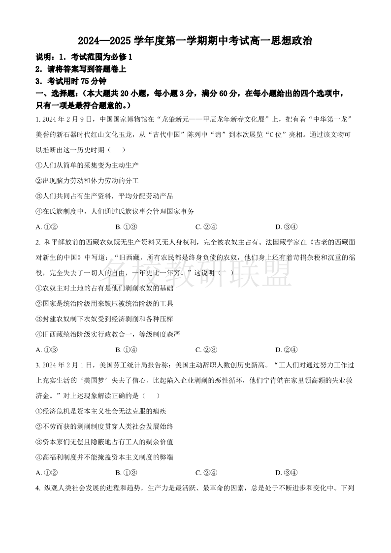 广东省茂名市电白区2024-2025学年高一上学期期中考试 政治