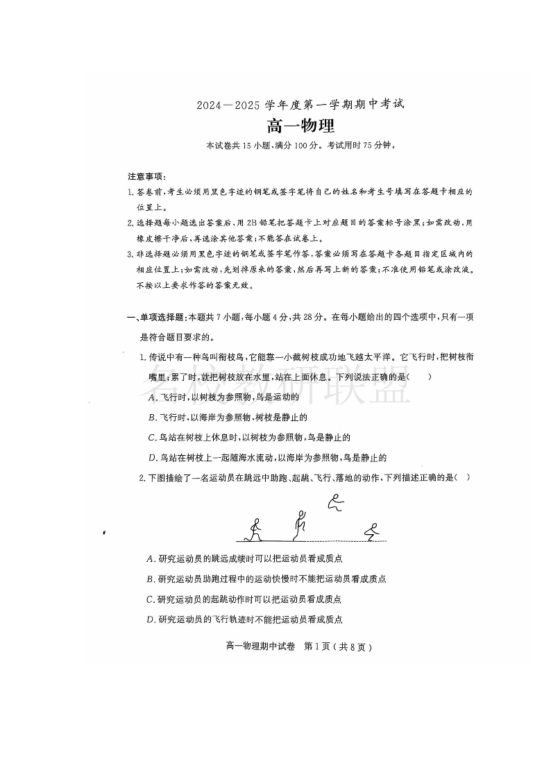 广东省茂名市电白区2024-2025学年高一上学期期中考试 物理