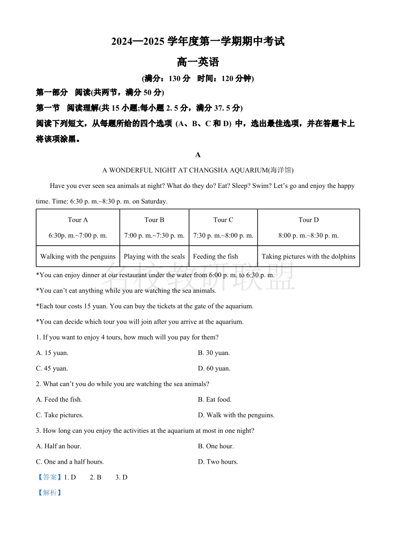 广东省茂名市电白区2024-2025学年高一上学期期中考试 英语答案
