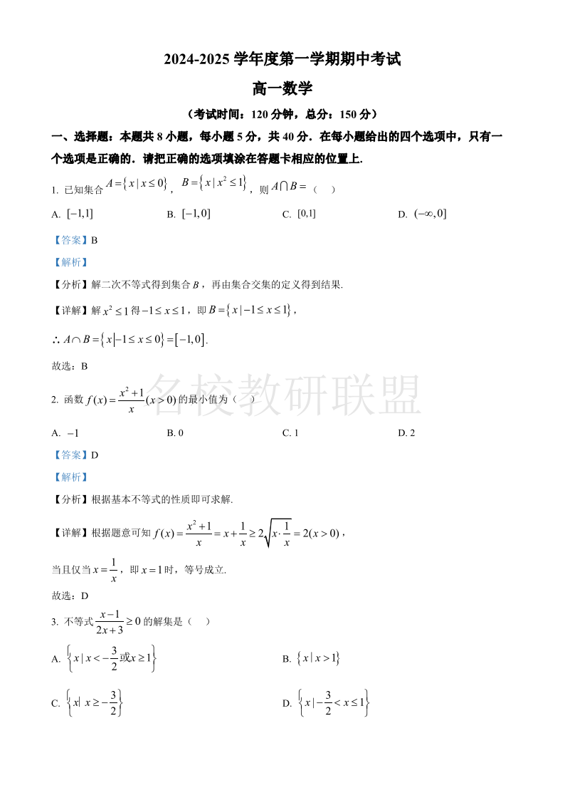 广东省茂名市电白区2024-2025学年高一上学期期中考试 数学答案