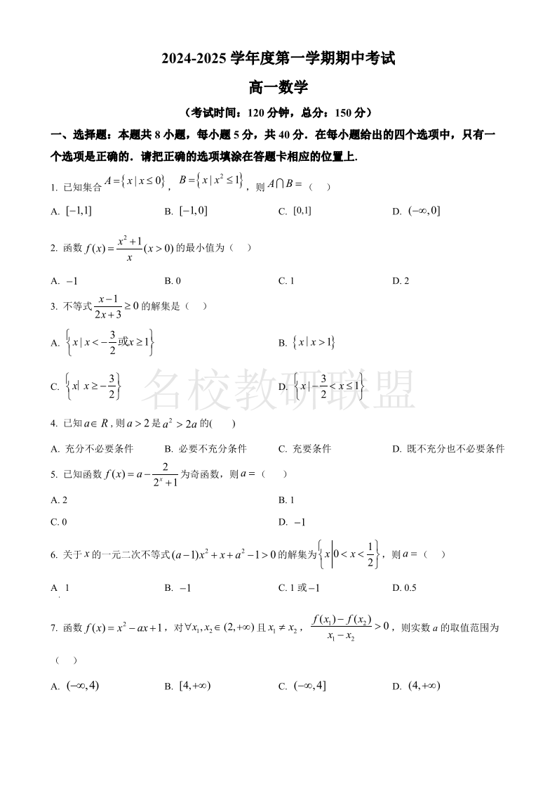 广东省茂名市电白区2024-2025学年高一上学期期中考试 数学