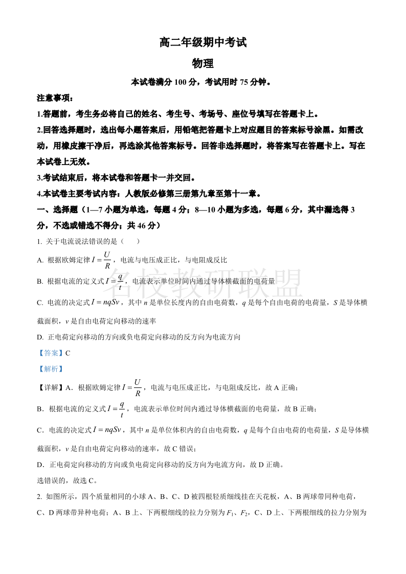 河北省保定市定州市2024-2025学年高二年级期中考试 物理答案