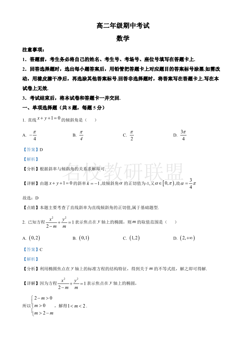 河北省保定市定州市2024-2025学年高二年级期中考试 数学答案