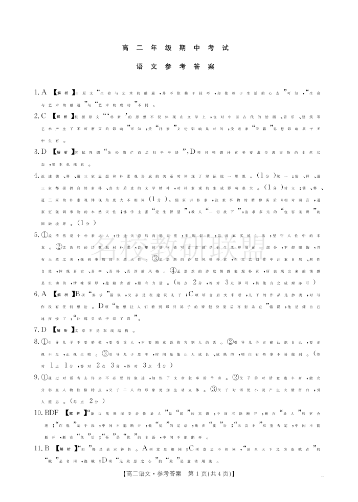 河北省保定市定州市2024-2025学年高二年级期中考试 语文答案