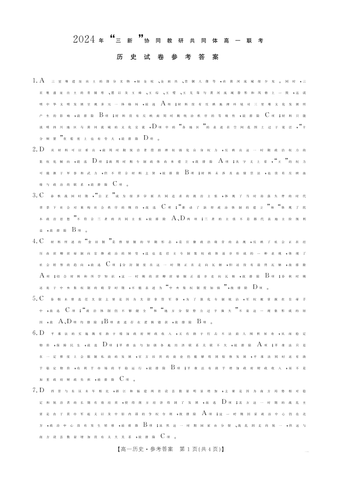 2025届江西三新协同联考高一联考试卷 历史答案