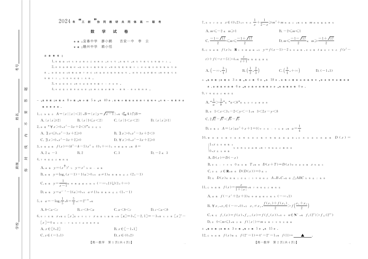 2025届江西三新协同联考高一联考试卷 数学