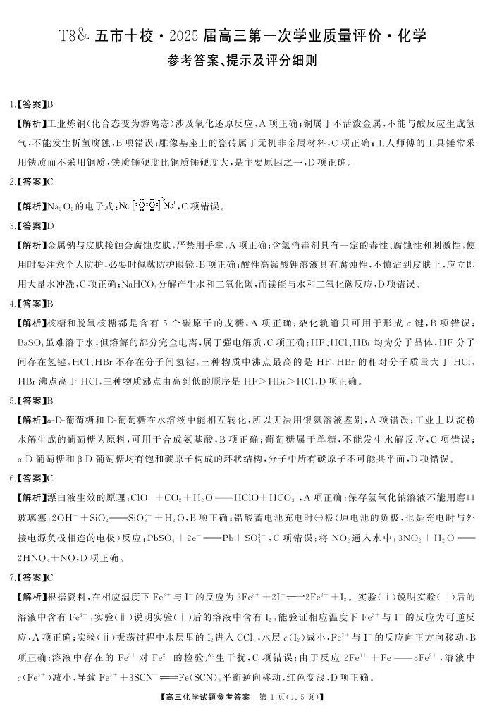 湖南省五市十校2025届高三第一次学业质量评价 化学答案