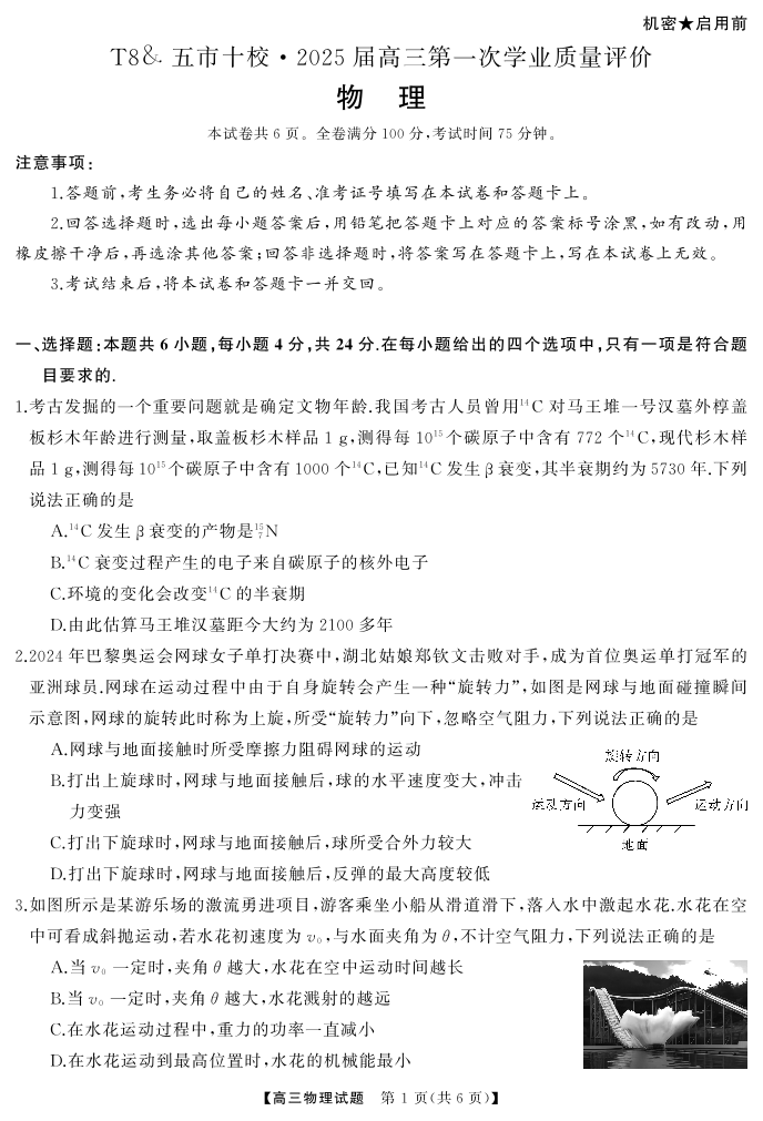 湖南省五市十校2025届高三第一次学业质量评价 物理