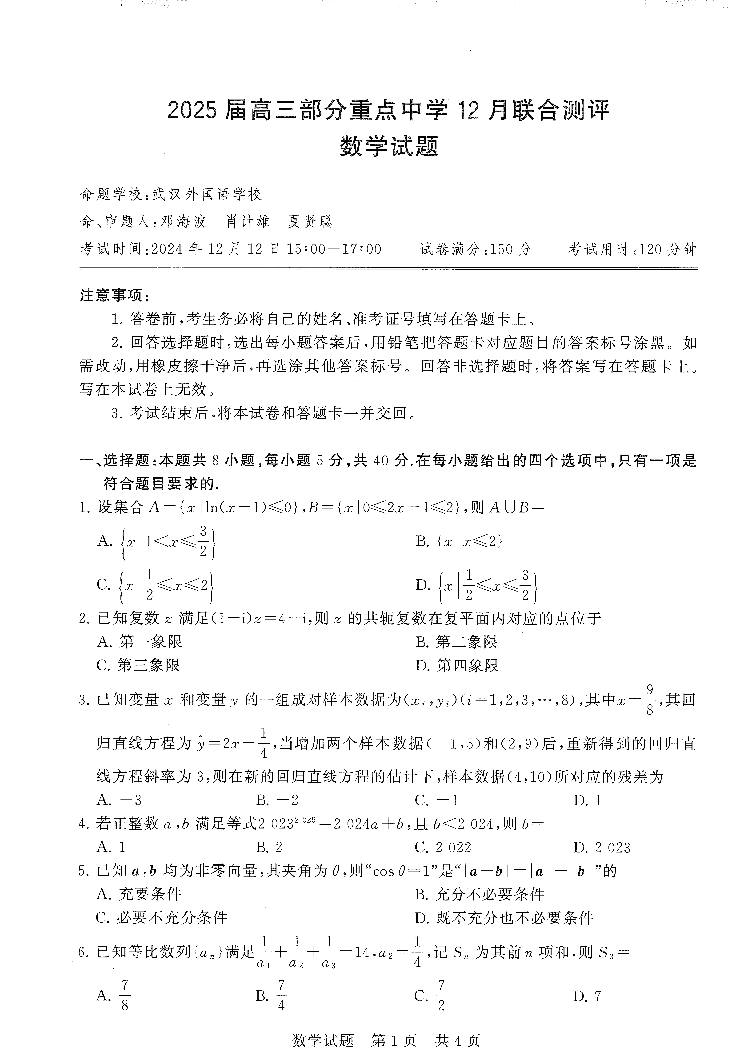 【T8联考】2025届高三部分重点中学12月联合测评 数学