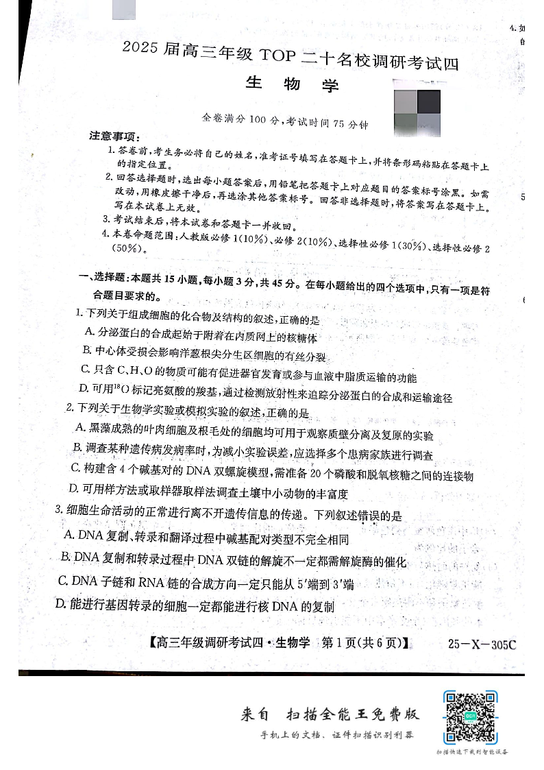 河南省2025届高三年级TOP二十名校调研测试四 生物