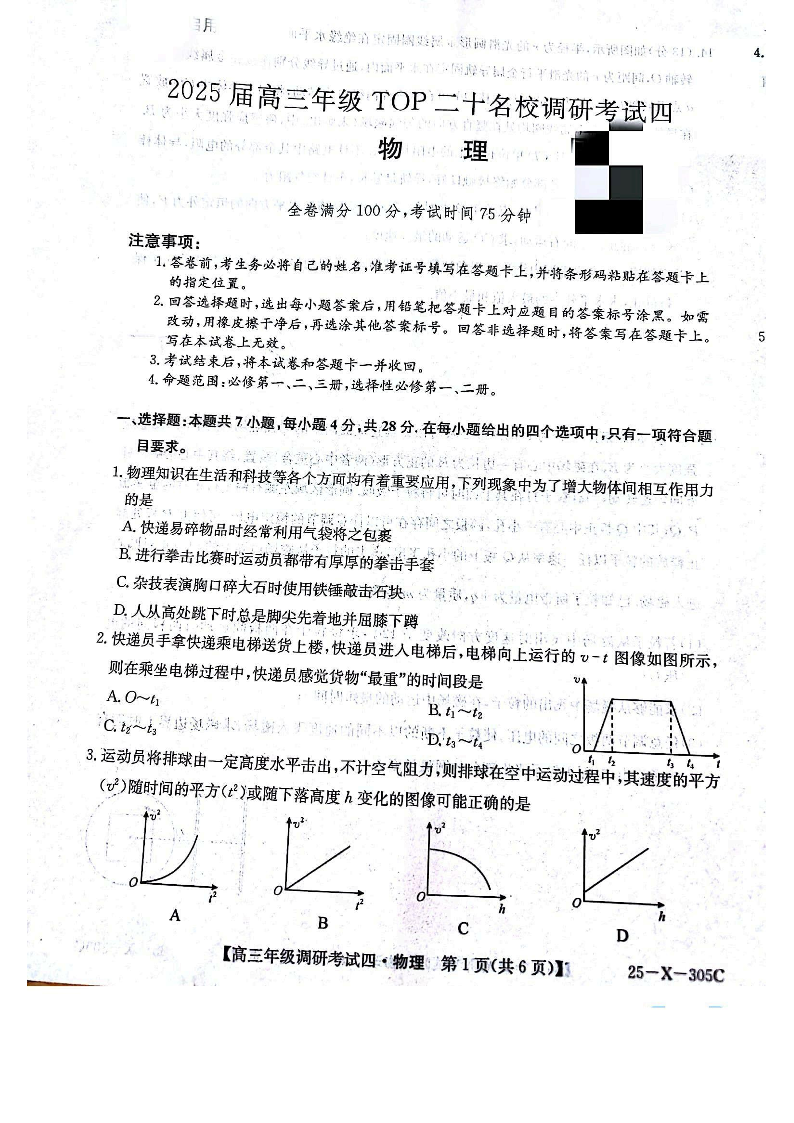 河南省2025届高三年级TOP二十名校调研测试四 物理