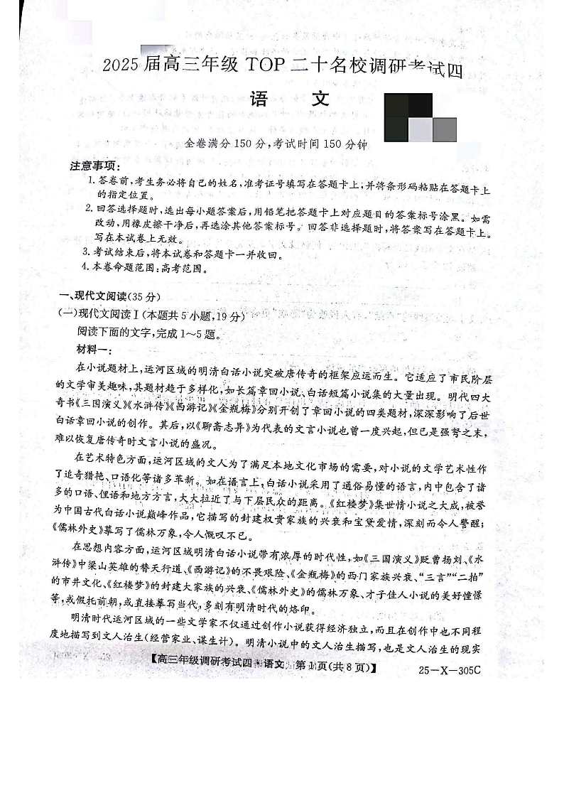 河南省2025届高三年级TOP二十名校调研测试四 语文