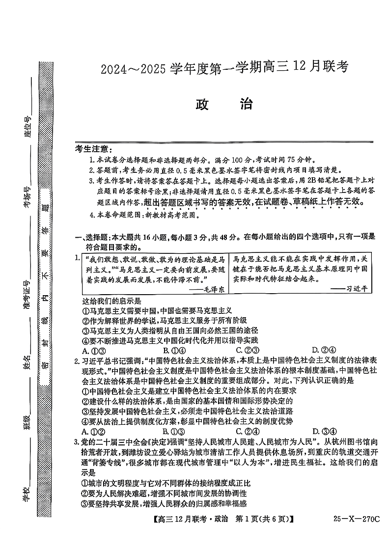 安徽省县中联盟2024-2025学年高三上学期12月月考 政治