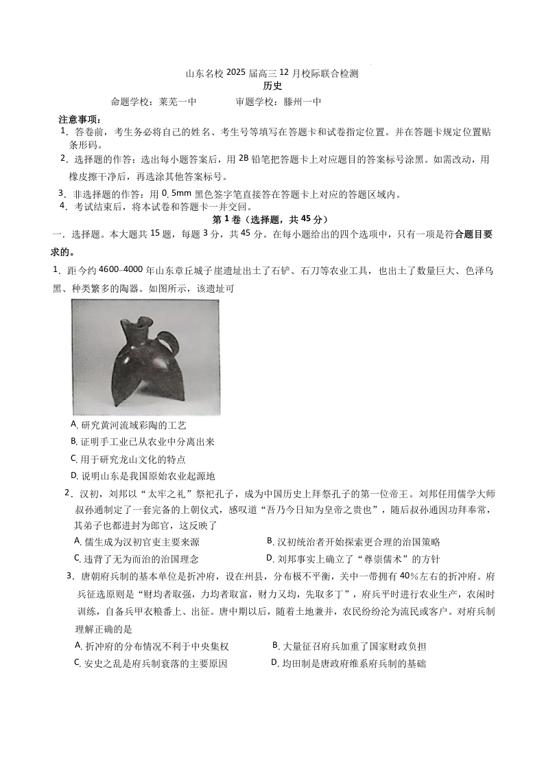 山东名校2025届高三12月校际联合检测 历史