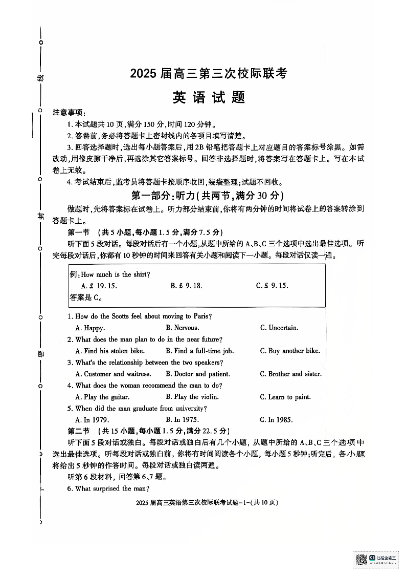陕西省汉中市2025届高三上学期第三次校际联考(12月)英语