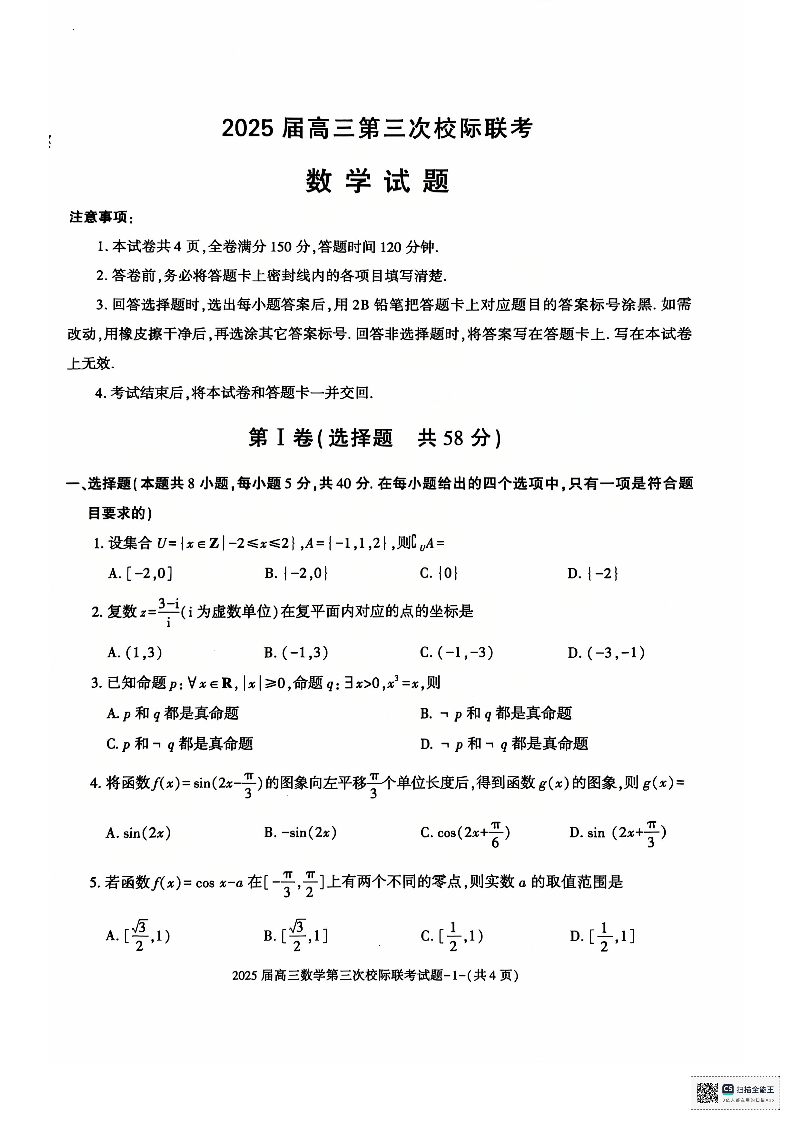 陕西省汉中市2025届高三上学期第三次校际联考(12月)数学