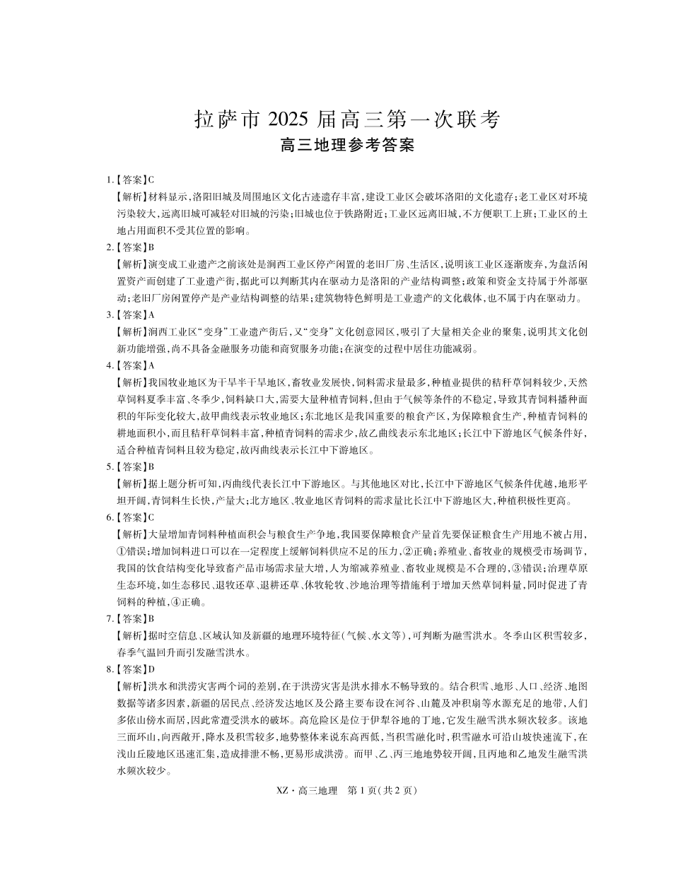 拉萨市2024-2025学年上学期第一次联考 文综地理答案