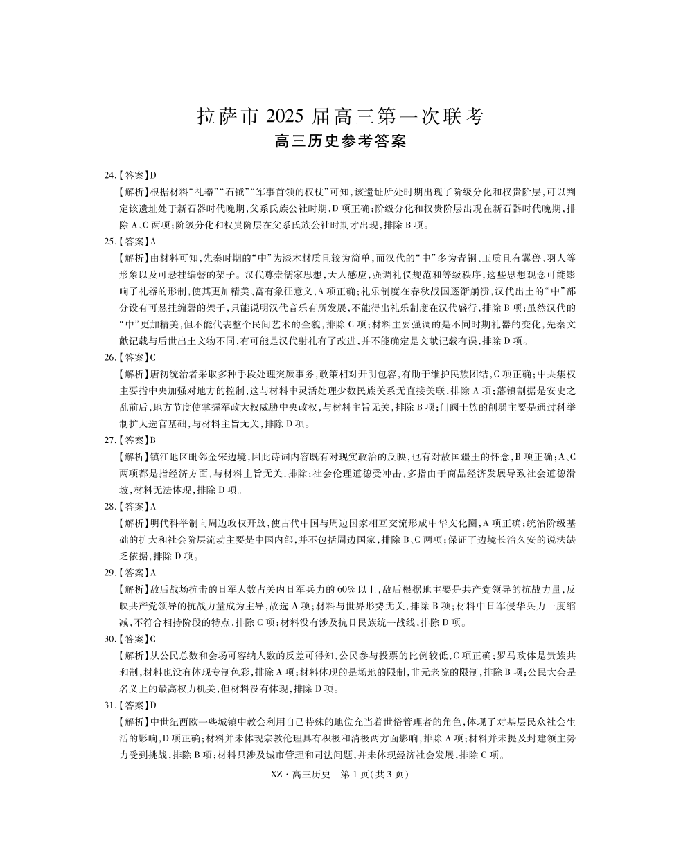 拉萨市2024-2025学年上学期第一次联考 文综历史答案