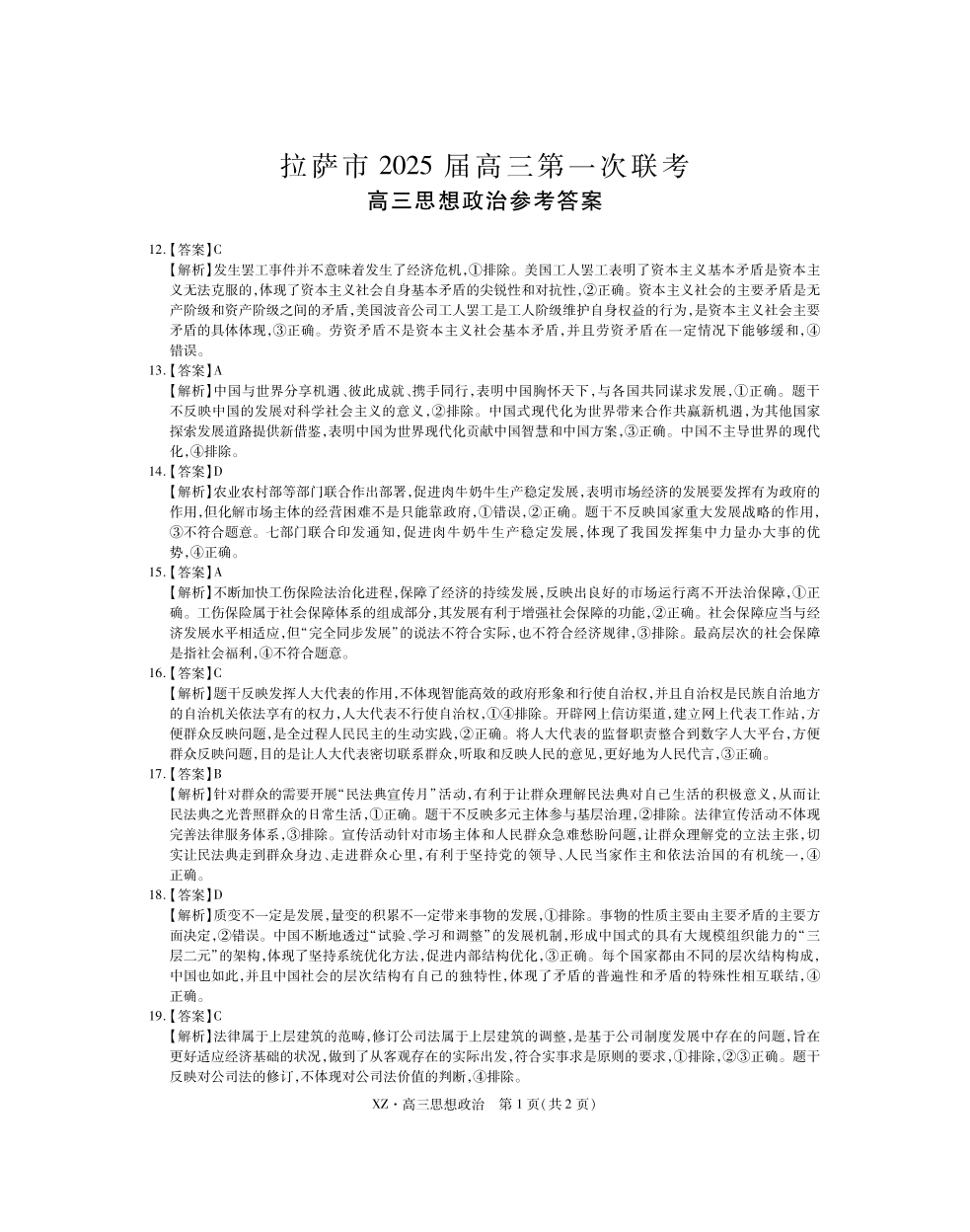 拉萨市2024-2025学年上学期第一次联考 文综政治答案