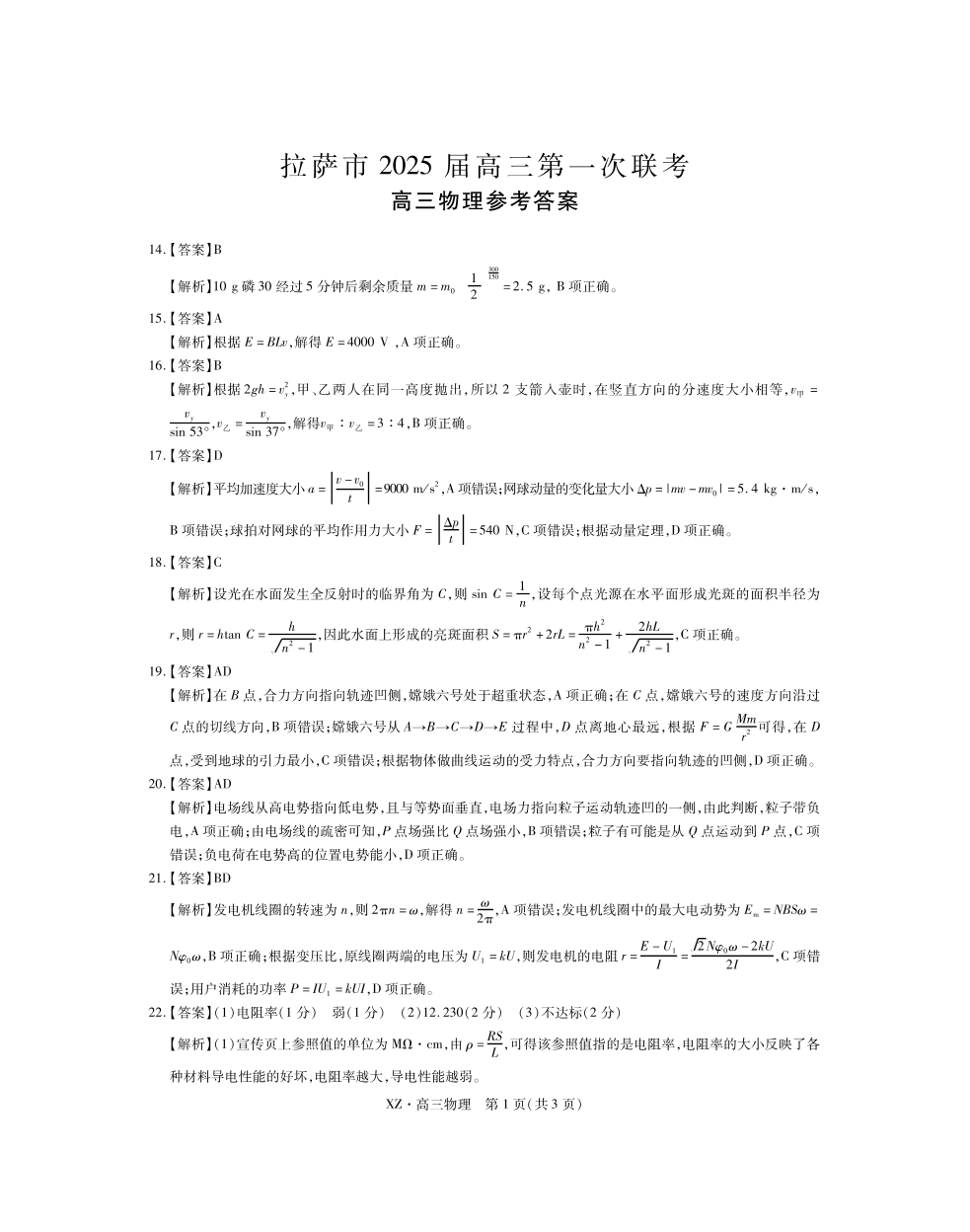 拉萨市2024-2025学年上学期第一次联考 理综物理答案