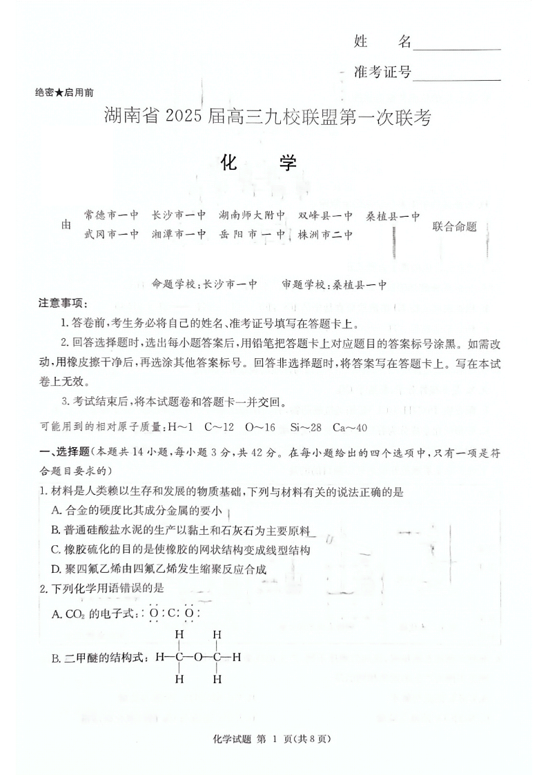 湖南省2025届高三九校联盟第一次联考 化学