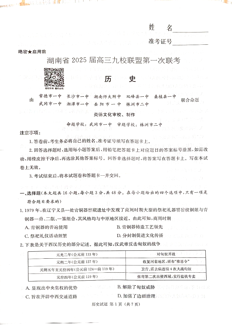 湖南省2025届高三九校联盟第一次联考 历史