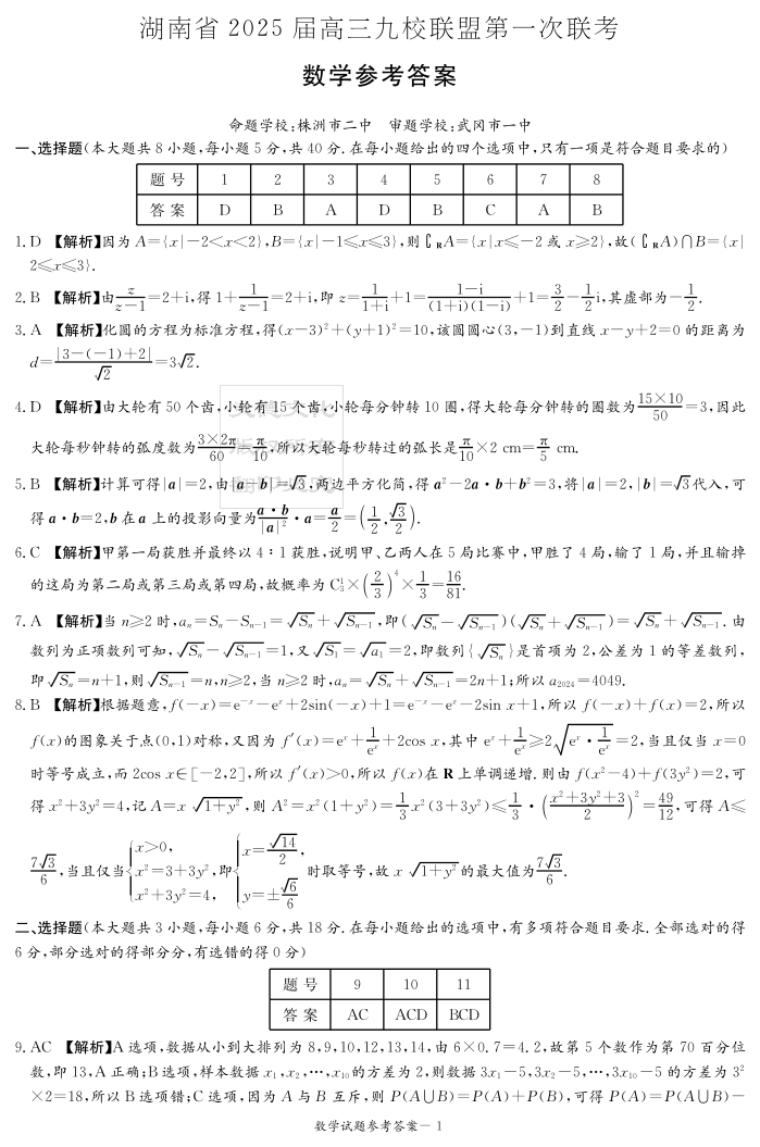 湖南省2025届高三九校联盟第一次联考 数学答案