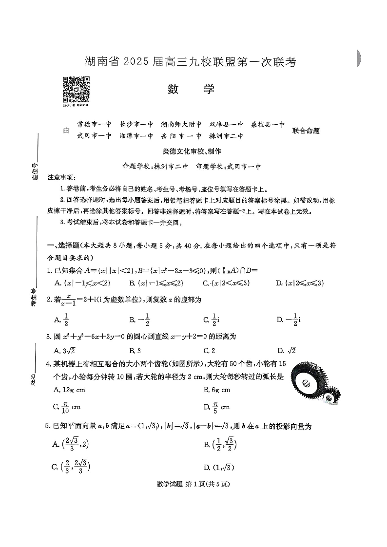湖南省2025届高三九校联盟第一次联考 数学
