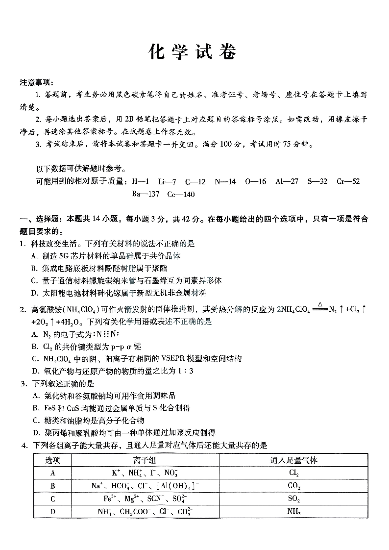重庆巴蜀中学2025届高三12月适应性月考(四)化学
