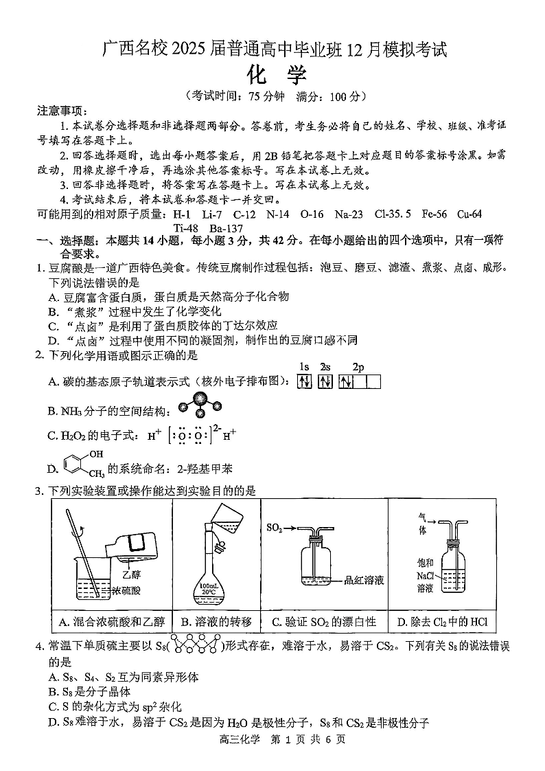 广西壮族自治区贵港市2024-2025学年高三上学期12月月考 化学