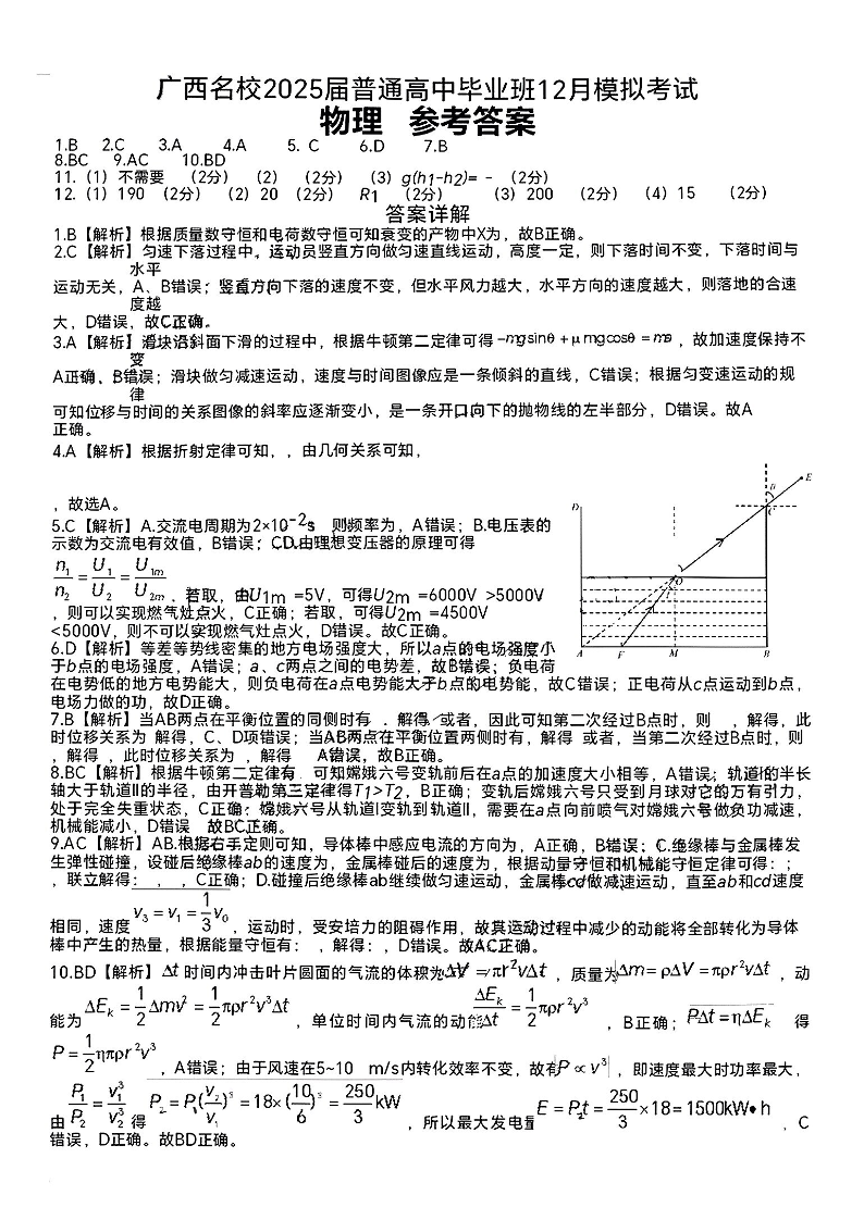 广西壮族自治区贵港市2024-2025学年高三上学期12月月考 物理答案