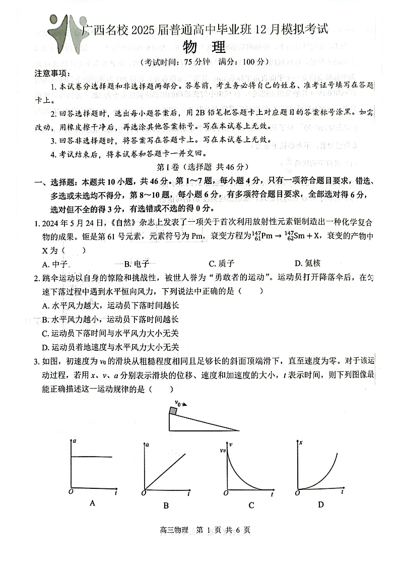 广西壮族自治区贵港市2024-2025学年高三上学期12月月考 物理