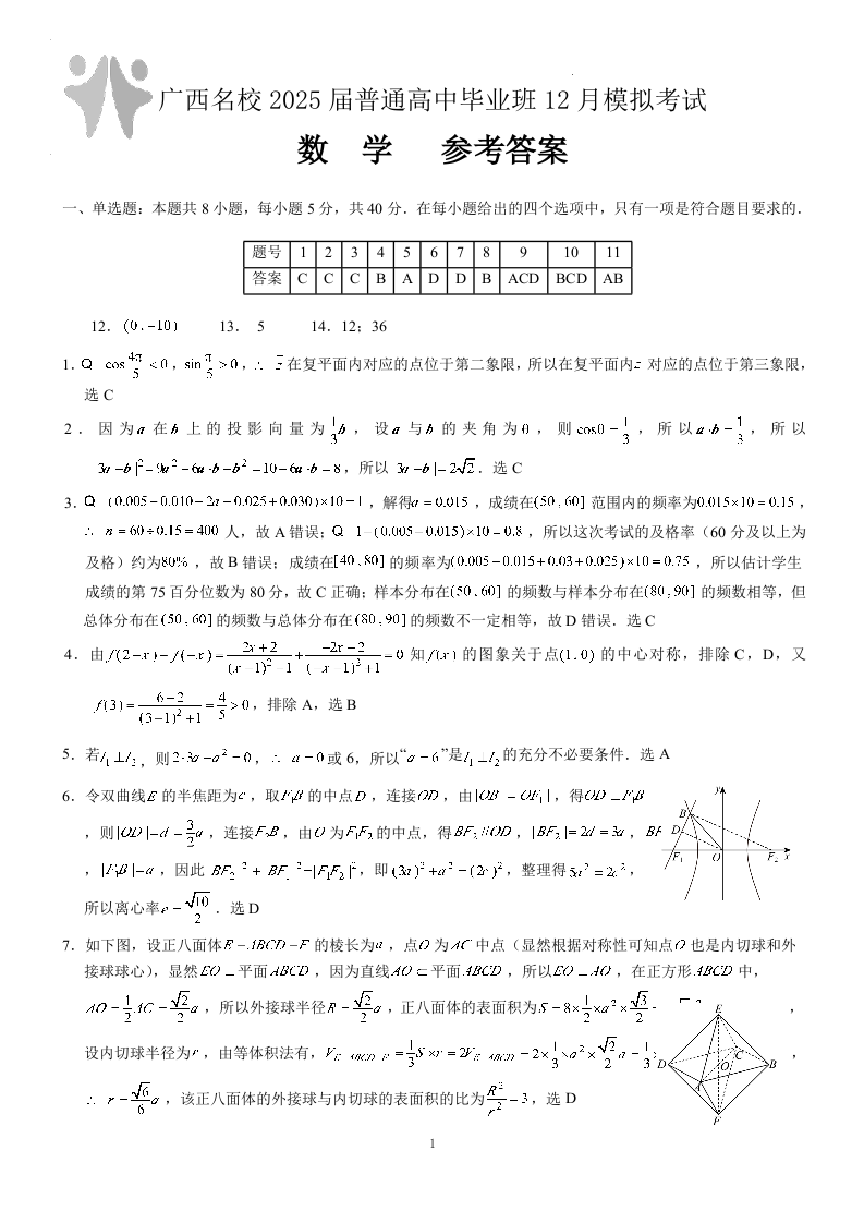 广西壮族自治区贵港市2024-2025学年高三上学期12月月考 数学答案