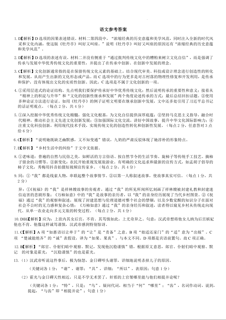 广西壮族自治区贵港市2024-2025学年高三上学期12月月考 语文答案