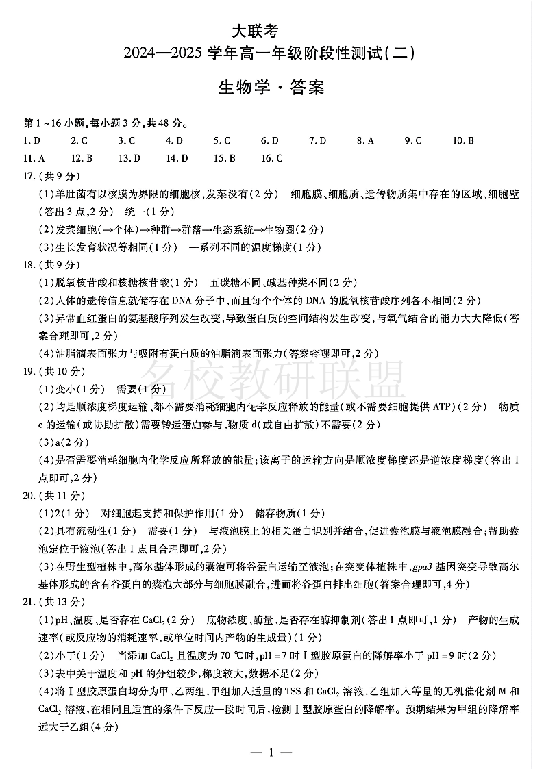天一大联考2024-2025学年高一年级12月阶段性测试(二)生物答案