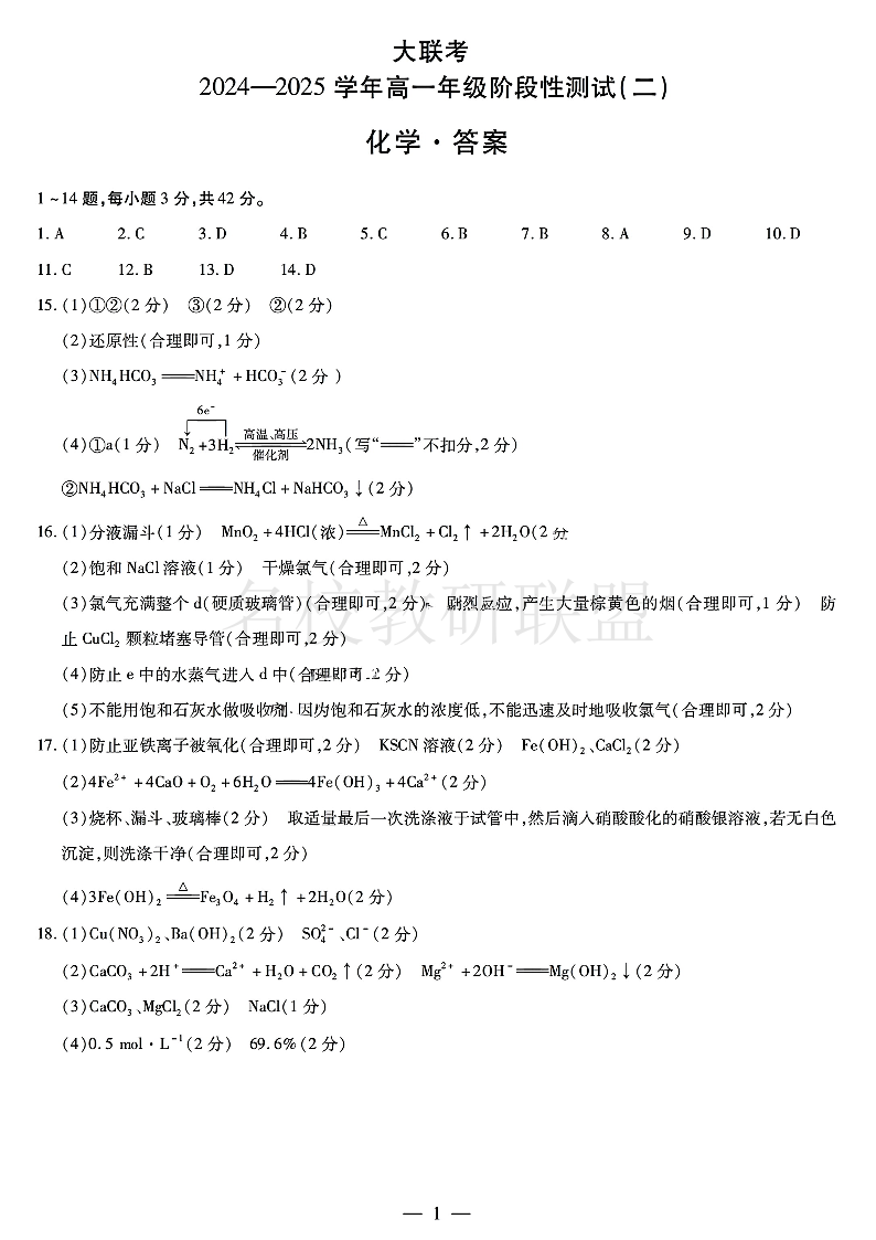 天一大联考2024-2025学年高一年级12月阶段性测试(二)化学答案