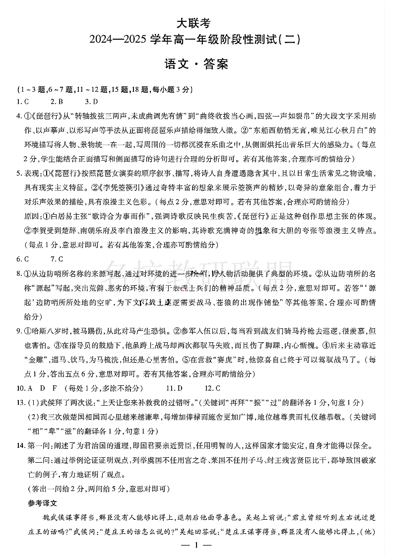 天一大联考2024-2025学年高一年级12月阶段性测试(二)语文答案