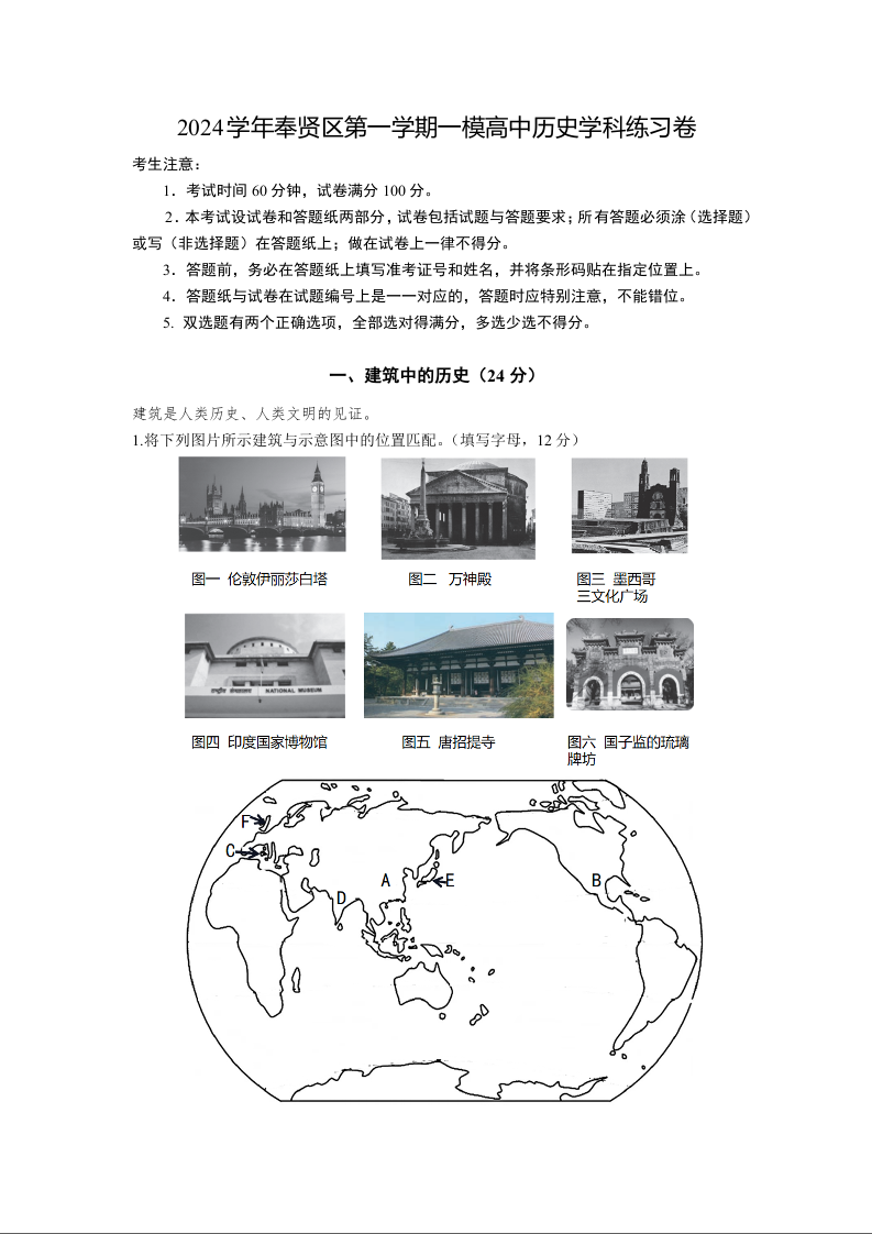 上海市2024学年第一学期奉贤区第一学期高三一模 历史