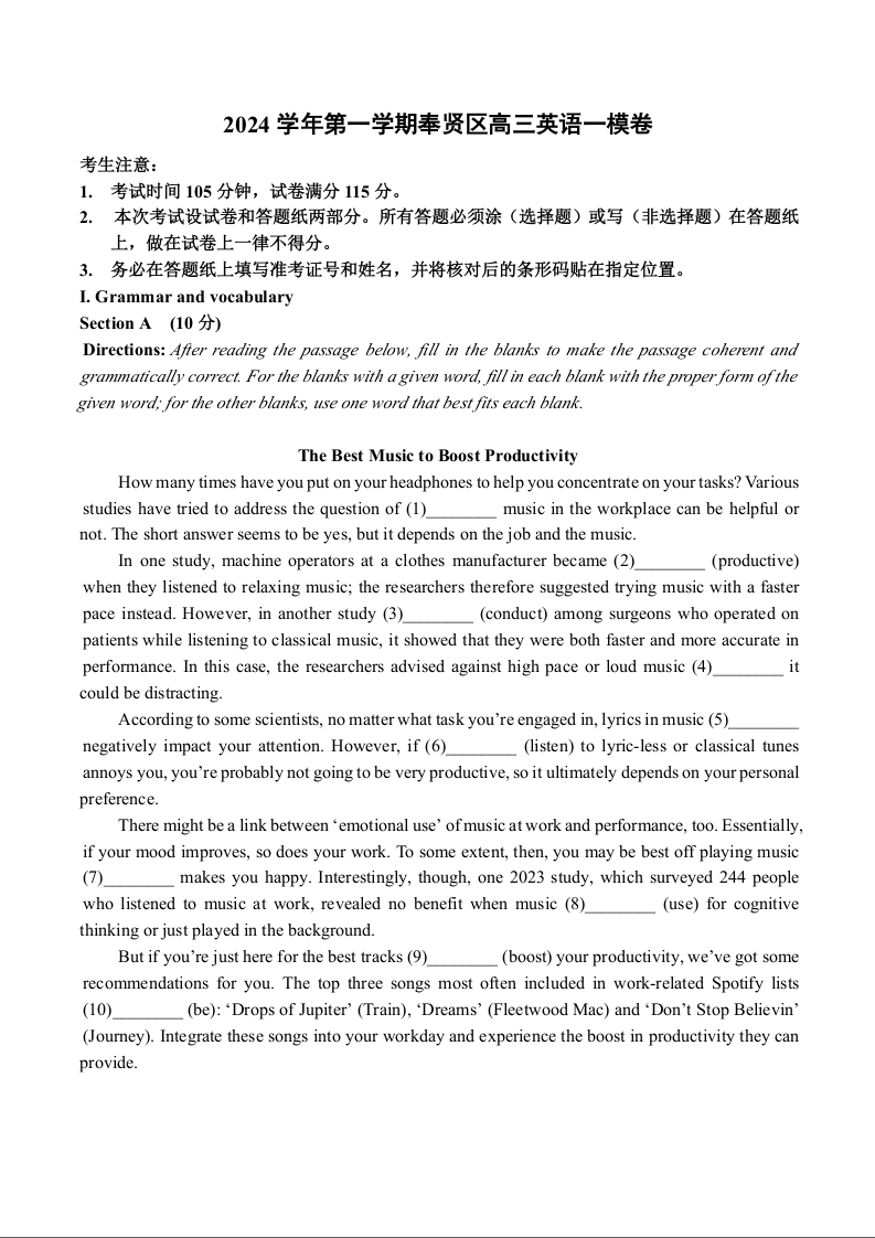 上海市2024学年第一学期奉贤区第一学期高三一模 英语