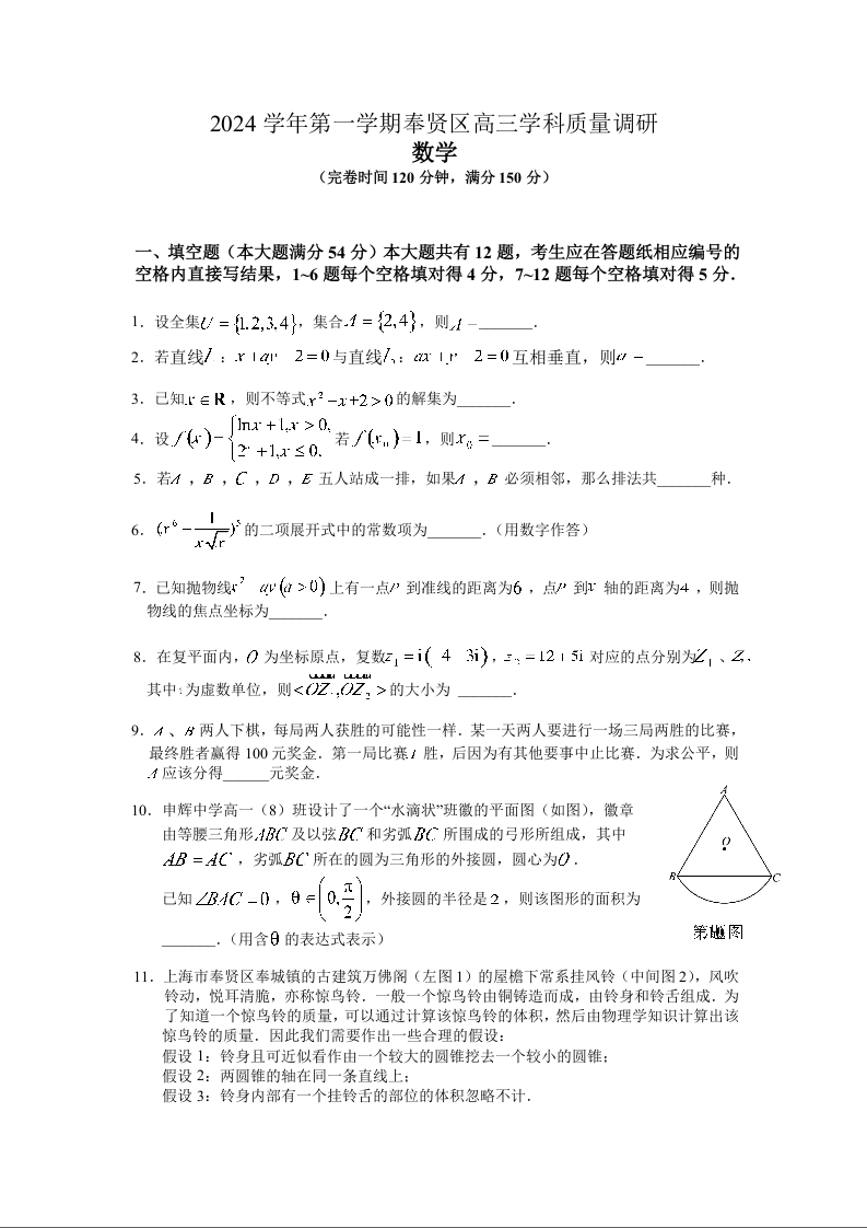 上海市2024学年第一学期奉贤区第一学期高三一模 数学