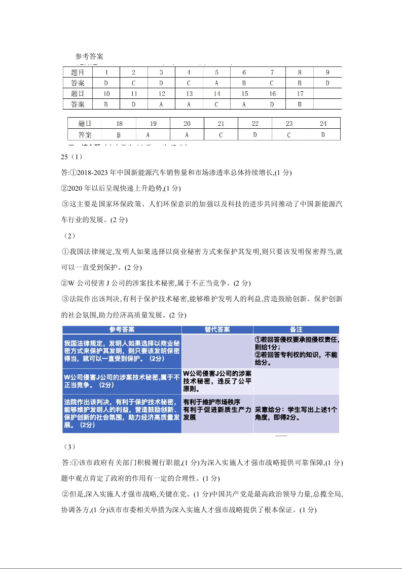 温州市普通高中2025届高三第一次适应性考试 政治答案