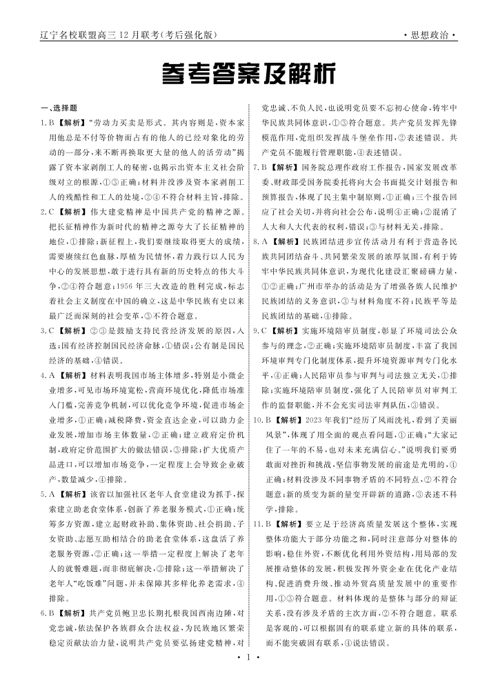 辽宁省名校联盟2024年高三12月份联合考试 政治答案