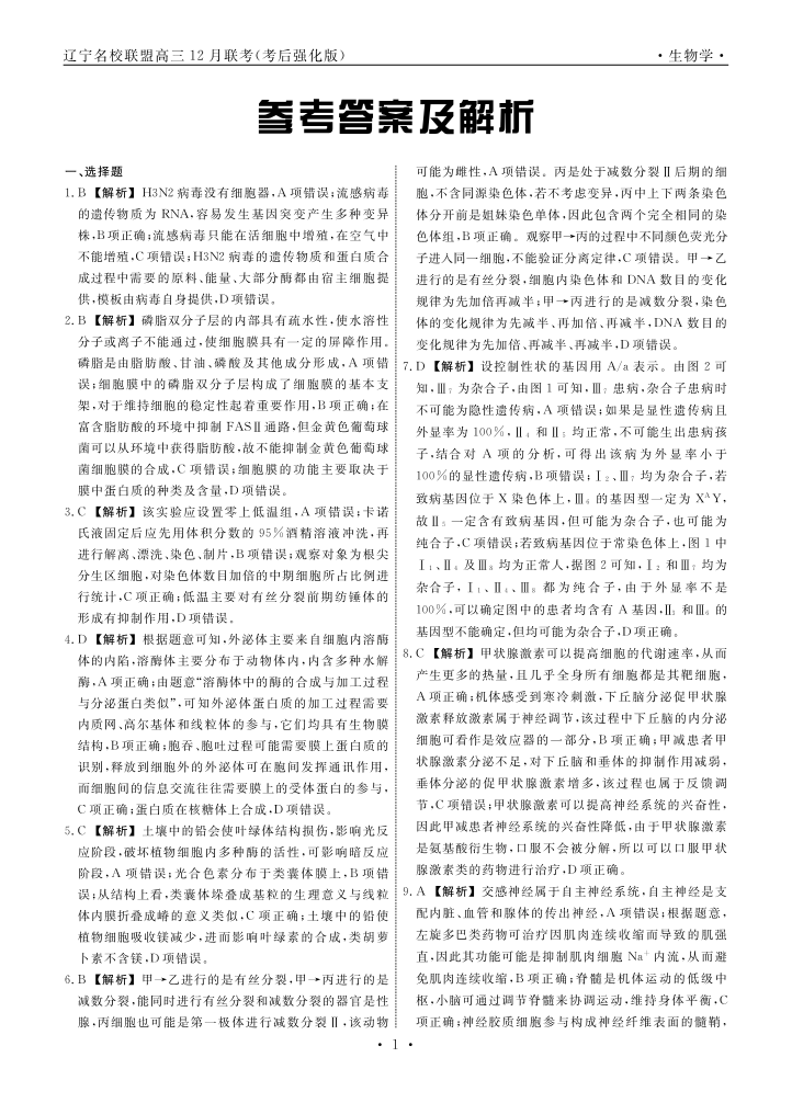 辽宁省名校联盟2024年高三12月份联合考试 生物答案