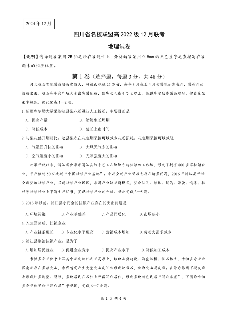 四川省名校联盟2025届高三12月联考 地理