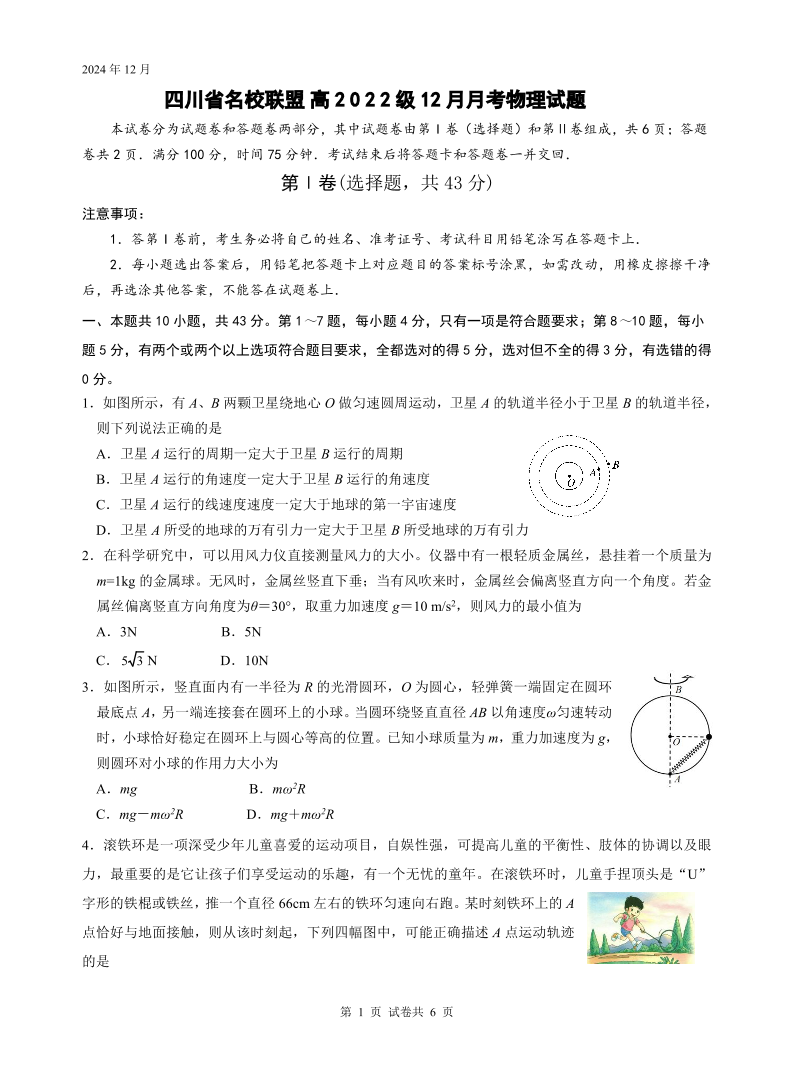 四川省名校联盟2025届高三12月联考 物理