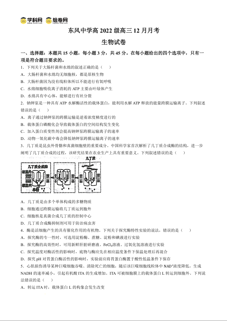 四川省南充市阆中东风中学校高2022级高三12月月考 生物