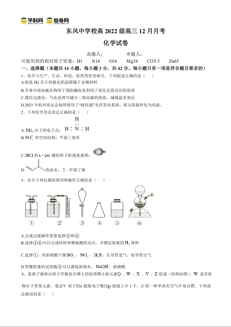 四川省南充市阆中东风中学校高2022级高三12月月考 化学