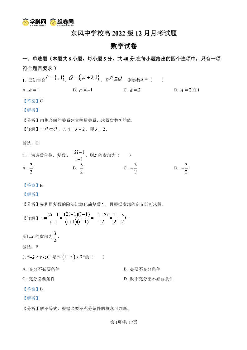 四川省南充市阆中东风中学校高2022级高三12月月考 数学答案