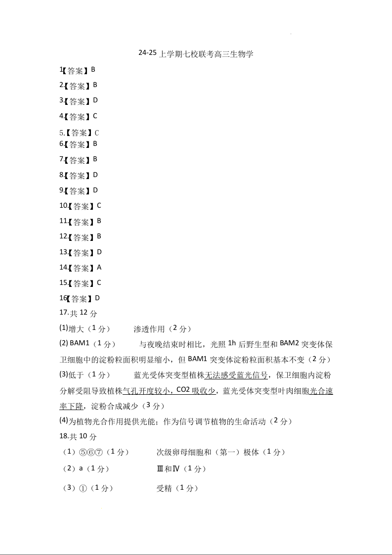 东莞市2024—2025学年第一学期七校联考 生物答案