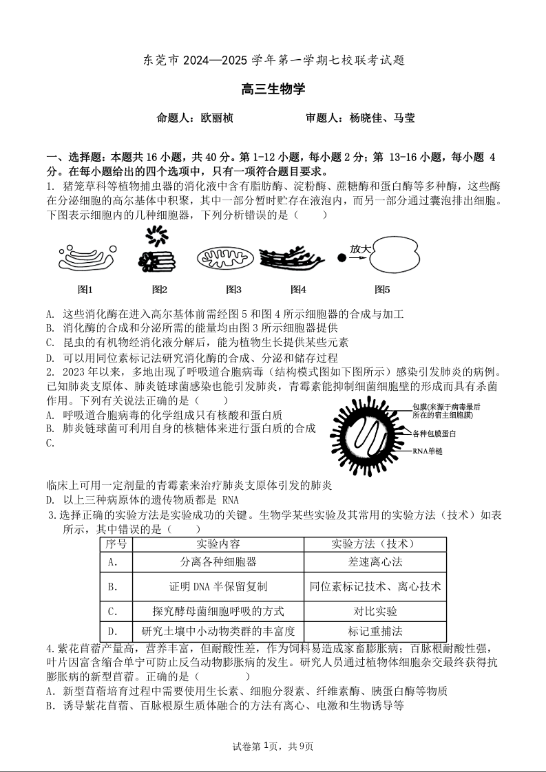 东莞市2024—2025学年第一学期七校联考 生物